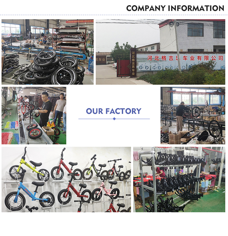 Hebei Gorgeous Bike Co., Ltd. es una empresa especializada en la producción y procesamiento de bicicletas para niños, bicicletas de equilibrio, scooters, columpio y varios tipos de accesorios para bicicletas. Gorgeous bike factory se estableció en 2015 con un capital registrado de 5 millones de RMB y un área de 10,000 metros cuadrados. Se puso en producción en junio de 2015, produciendo bicicletas para niños y bicicletas sin pedales alrededor de 25,000 piezas durante todo el año. Con una calidad de producto de primera clase, la producción se ha duplicado durante cinco años consecutivos. Hay más de 70 empleados en la fábrica y los productos se venden en más de 20 provincias y ciudades de China. Cooperación a largo plazo con la empresa comercial, exportación a más de diez países diferentes, como Europa y el sudeste asiático.